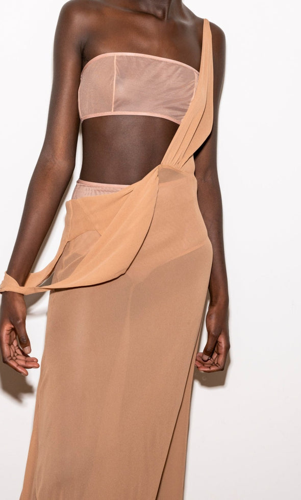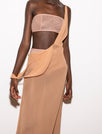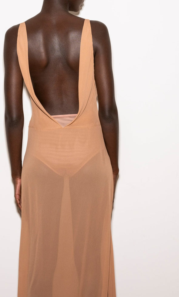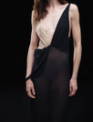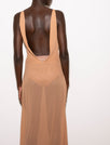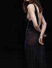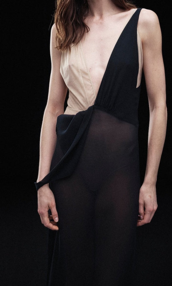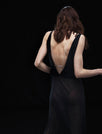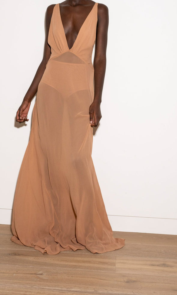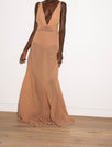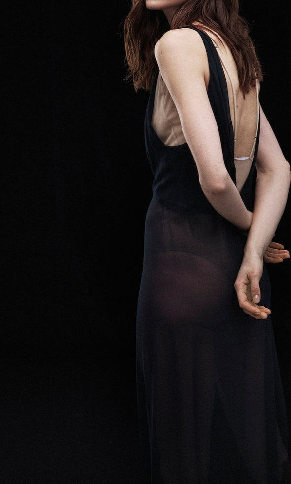 The Alma dress in 100% silk offers a sleek silhouette with a plunging neckline and free flowing skirt that creates movement and light.