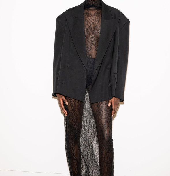 The structured Blazer is tailored from 100% wool, intentionally oversized and offered in one size only it can be worn draped over any of the delicate dresses in the collection for a juxtoposed look.