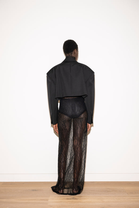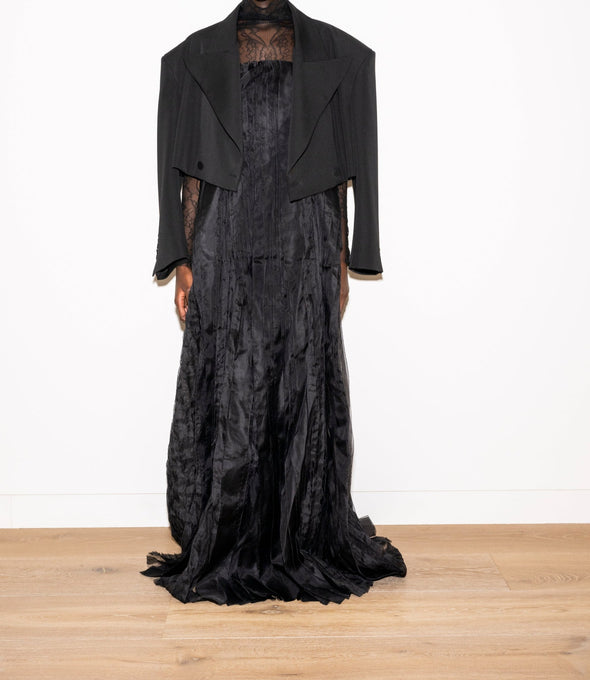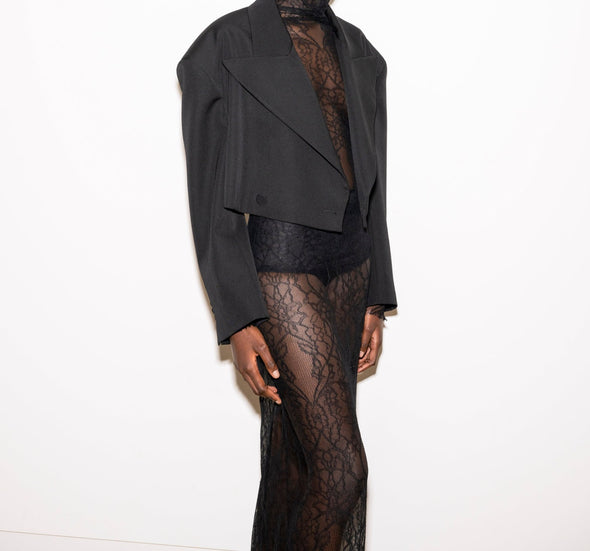The structured Crop is tailored from 100% wool, intentionally oversized and offered in one size only it can be worn draped over any of the delicate dresses in the collection for a juxtaposed look.
