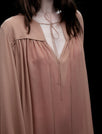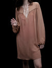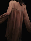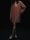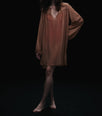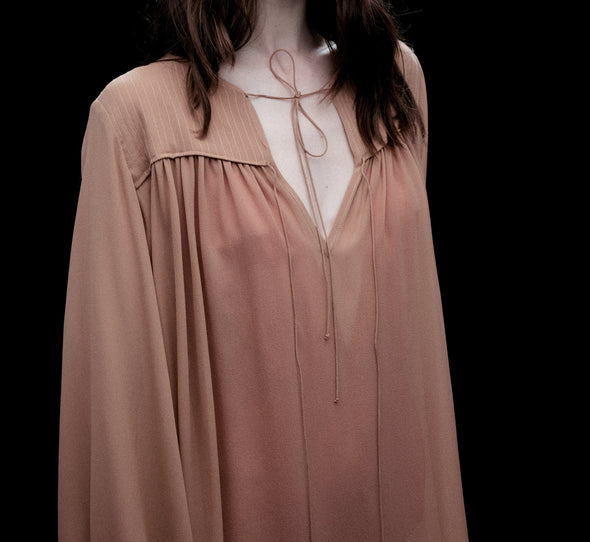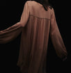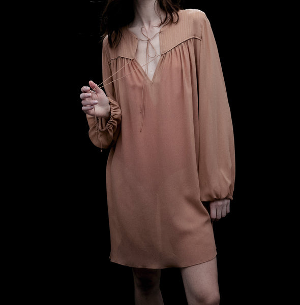 The Estela dress is designed with a bohemian feel, featuring smocked details, billowy sleeves, metallic thread across the shoulders and tie detailing. Cut from a silk Georgette fabric, it can be worn over contrasting underwear or thrown on over a bikini.