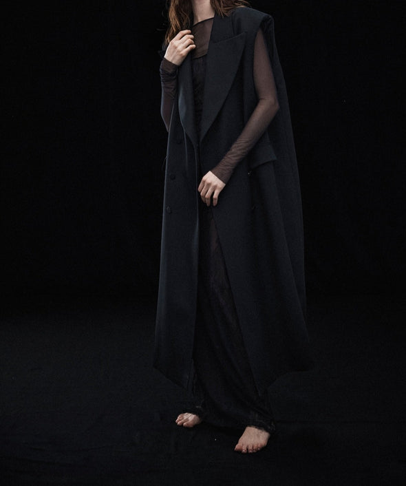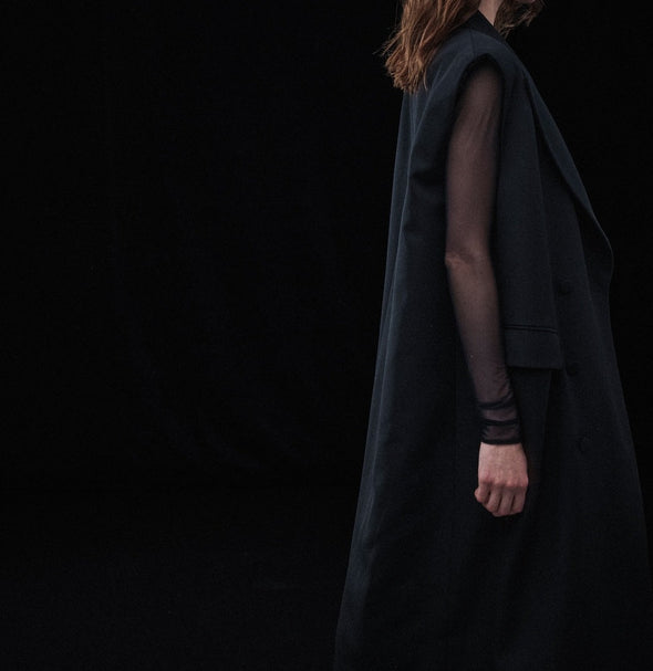 The structured Long Waistcoat is tailored from 100% wool, intentionally oversized and offered in one size only it can be worn draped over any of the delicate dresses in the collection for a juxtaposed look.